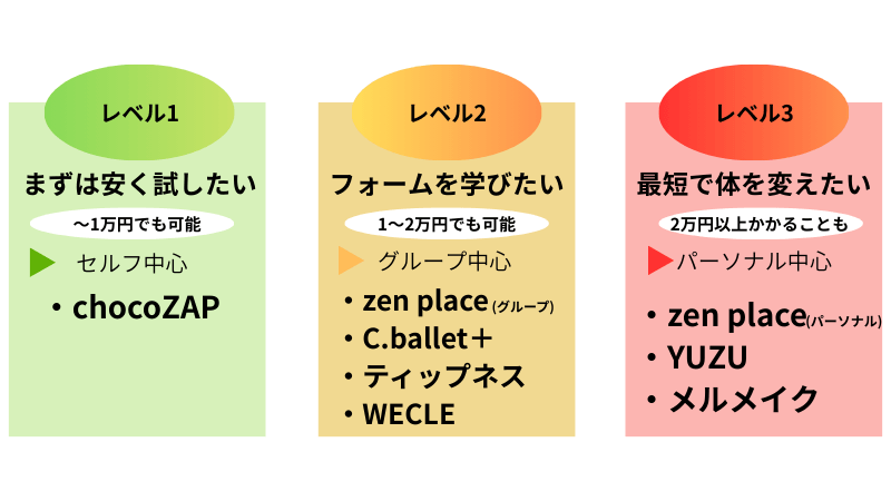 →zen place(グループ)、C.ballet、ティップネス、WECLE - 最短で体を変えたい